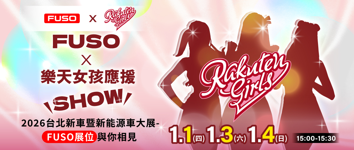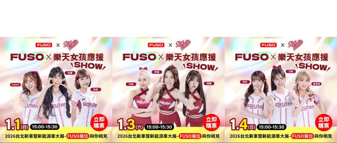 2026 台北新車暨新能源車大展 FUSOx最強應援 這站絕對要來! 超人氣 樂天女孩 滿滿笑容與活力 絕對讓你的車展體驗加倍精彩 1/1、1/3、1/4,每天下午 15:00–15:30 每日不同陣容 總共九位女孩 FUSO 展區限定 與大家見面 還有多項車款亮點展示,讓你一次體驗品牌最新科技與設計魅力 快把這三天的時間記下來 邀請朋友一起來感受車展熱力現場! 距離入場欣賞女神精彩演出 ※貼心提醒:本場活動於 FUSO 展位 舉行,相關活動內容與細節,將以 FUSO 品牌官方公告 為準 立即購票