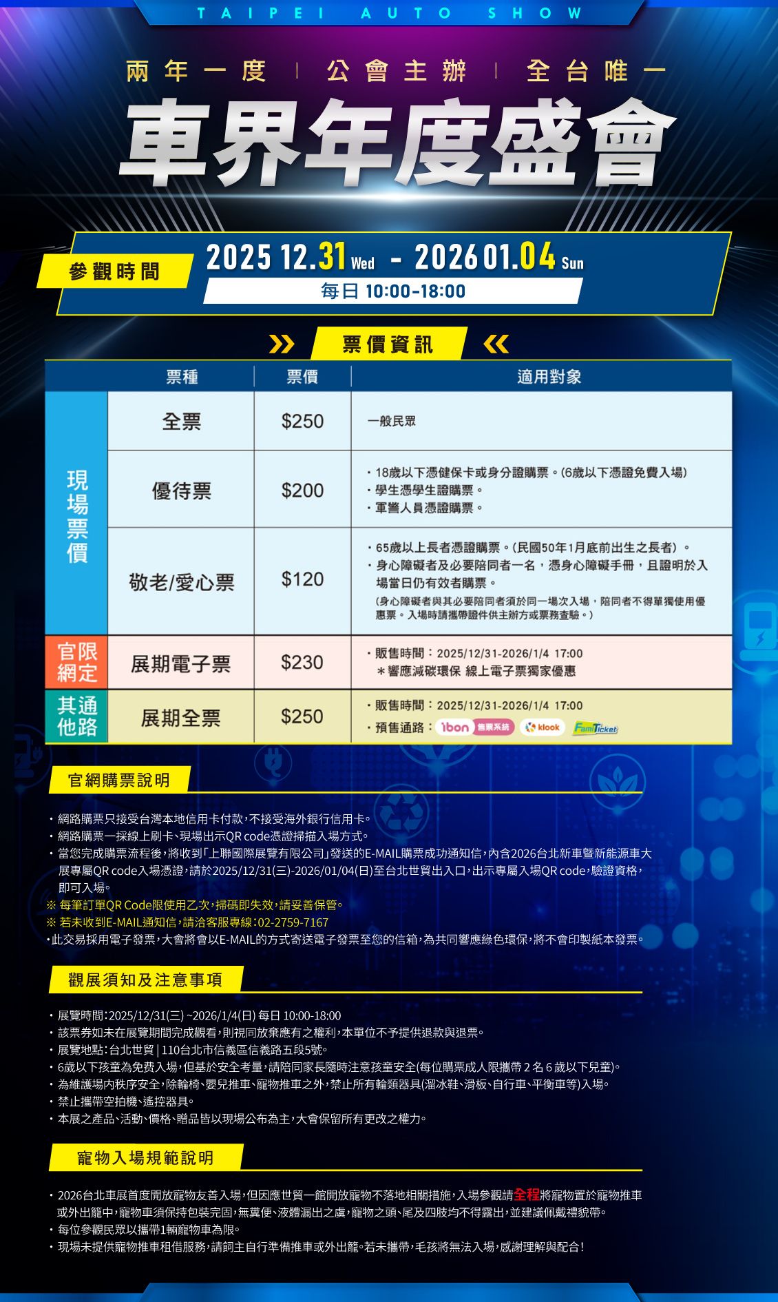 2026台北新車暨新能源車大展 12/31-2026/1/4 兩年一度 公會主辦 全台唯一強勢登場
