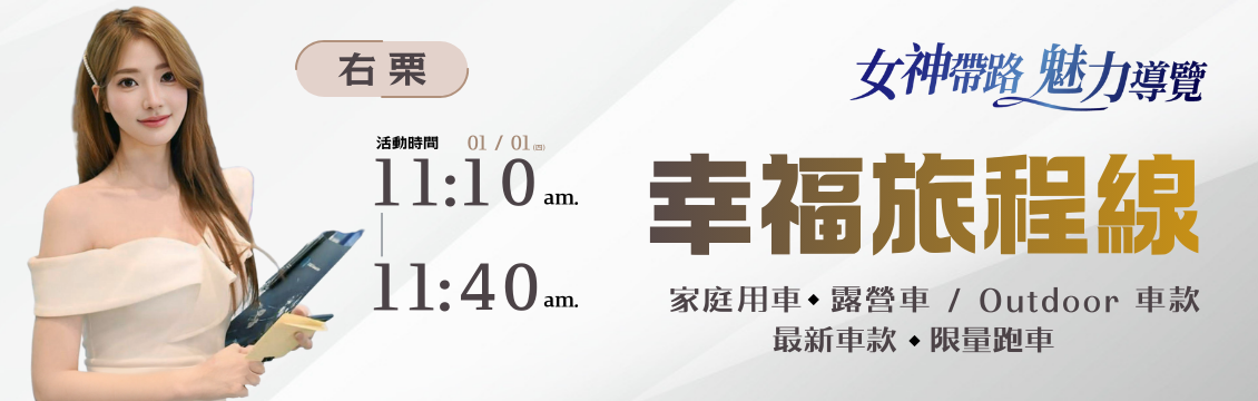 多元生活風格為主題,由氣質女神-右栗,陪同探索從城市通勤、公路旅行、假日露營、家庭用車,各式理想車款感受車輛如何融入日常、延伸幸福半徑。