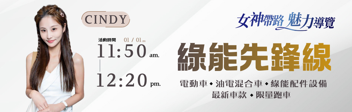由元氣女神-Cindy領軍啟程,帶您進入未來移動的核心世界!聚焦新能源車、電動車、油電混合車與智慧充電等前瞻展區,讓您一次掌握新能源趨勢,不僅看車,更是一場「滿滿能量、滿滿電力」的綠色旅程!