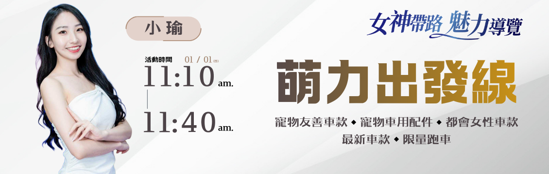 本屆車展首次開放寵物友善入場,特別推出「萌力出發線」,由活潑甜美的小瑜領軍,精選寵物友善車款與實用相關展示,讓您與毛孩都能安心出遊,開啟與毛寶貝共享的移動新生活